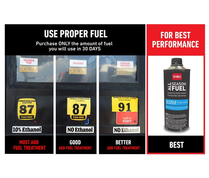 The big game is nearly here but you've got snow to plow. No worries, you'll be back to the action in no time with the Toro Power Clear® 721 QZE Single Stage 21 in. Gas Snow Blower. Quickly and easily change the chute direction without skipping a beat. Just squeeze the quick-shoot trigger and slide the grip. Starts easily with electric start. Even deep snow jobs are a cinch, as the 212cc 4-cycle OHV engine launches snow 35 feet. Shred snow fast with the patented Power Curve® system, while the self propel Power Propel® system gets you moving on quickly. You'll have more room for storage with the blower's compact design. With Toro's 2-year Guaranteed-to-Start promise and 2-year limited warranty, you're ready for whatever winter has in store. Count on it. Fold-down handle and chute make storage or transport simple. Storage dimensions: 33" x 21" x 34" (84 cm x 54 cm x 87 cm). Choose the right fuel for your snow blower. For best starting results use Non-ethanol fuel with an octane rating of 87 or higher. Use fresh fuel less than 30 days old, add fuel stabilizer to reduce starting problems. Do not mix oil with gas.